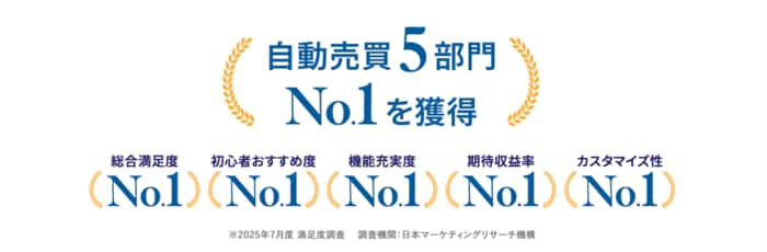 満足度調査では初心者部門含め5部門でNo.1!実際に自動売買を始めた50.5%が初心者だから安心して始められるよ。