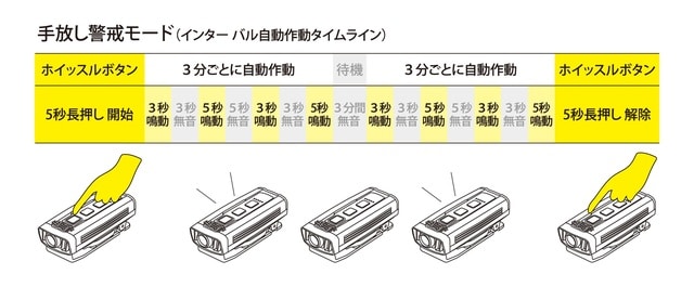 通常は押している間にホイッスルが鳴りますが、5秒間長押しで「手放し警戒モード」に切り替わり、自動で連続して電子ホイッスルを鳴らすこともできます。