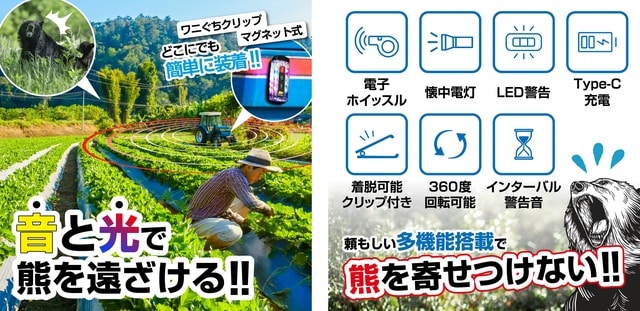 充電式(Type-C)で最大8時間のLED点滅連続使用が可能。ワニぐちクリップ・マグネット式など複数の装着方法に対応し、畑仕事や登山、林業、農業などにおいて、熊に遭遇するリスクを回避するためのアイテムです。