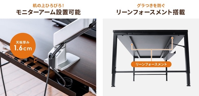 作業デスクを自分の使いやすいように、クランプ製品・モニターアーム取り付け対応。限られた天板スペースを有効活用でき、姿勢改善や配線整理にもつながります。趣味の制作や配信、ゲーミング環境づくりにもおすすめです。また、天板裏にリーンフォースメントが2本通っており、たわみなどを抑制して快適にデスクを使用できます。