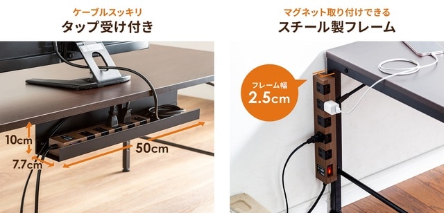 机上が整うと、集中力も上がります。天板下にはタップ受けを装備し、電源タップの置き場問題を解決します。掃除や機器の入れ替えもスムーズで、日々の“ちょいストレス”を減らします。また、スチール製のフレームになっているため、マグネット取付でフレームに様々な収納グッズを取り付けることもできます。