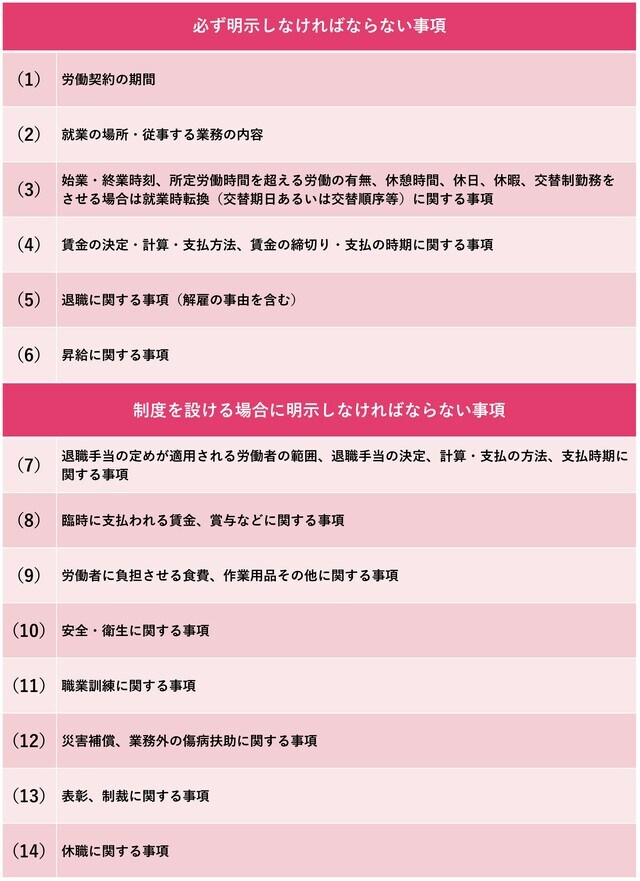賃金を含め、労働条件通知書では、下記の(1)~(6)は必ず明示しなければならない事項となっています。そして(7)~(14)は、制度を設ける場合に明示しなければならない事項です。