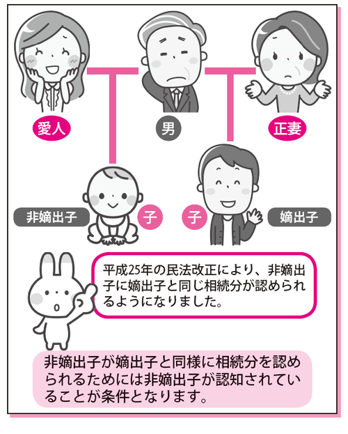 愛人の子どもを非嫡出子、本妻の子どもを嫡出子といいます。旧民法では、非嫡出子の相続分は嫡出子の半分でしたが、平成25年9月5日以降に開始された相続から、同じ相続分が認められるようになりました。