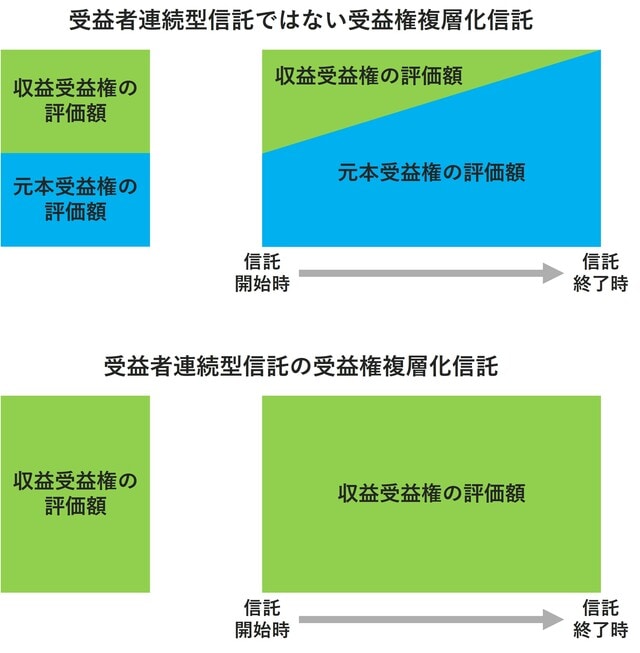 受益権複層化信託における収益受益権の評価と元本受益権の評価は、下記のイメージ図のように評価されます。受益者連続型信託と受益者連続型信託ではない信託では、受益権の評価額が異なるため要注意です。これらを十分に検討せずに組成すると、思わぬ課税が生じることとなります。