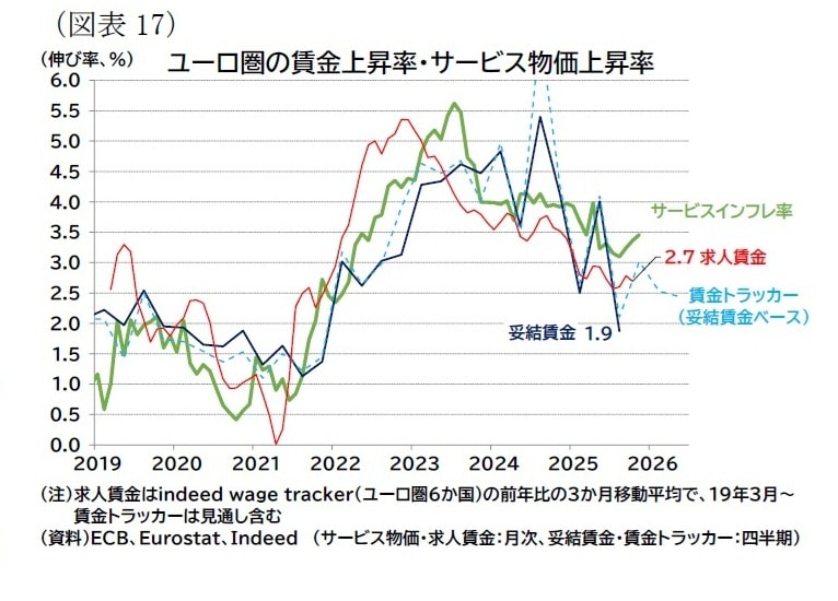 コアインフレ率がやや高めの推移が続いているのは、サービスインフレの鈍化ペースが遅いためである。ただし、サービスインフレと相関の強い賃金上昇率は、先行指標(求人賃金上昇率や締結済の賃金動向を集計したECBの賃金トラッカー)では鈍化傾向が鮮明になっていることから、賃金上昇圧力から生じるインフレ上振れ懸念は低下している[図表17]。