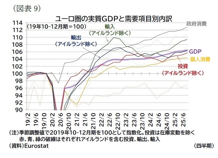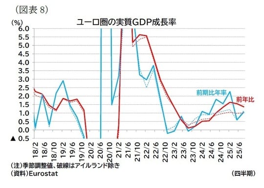 ユーロ圏の7-9月期の実質成長率は前期比0.3%(年率換算:1.1%)となった[図表8]。25年の成長率は、1-3月期(前期比0.6%、年率2.3%)に前倒し生産・輸出で大幅に加速した後、4-6月期(前期比0.1%、年率0.6%)は駆け込みの剥落で減速したものの、大きな反動減を回避しプラス成長を維持した。そして7-9月期は4-6月期から加速し、底堅い推移が続いている。基調的な動きを追いやすい前年比で見ても7-9月期は1.4%と1%台半ばの成長を維持している[図表8]。