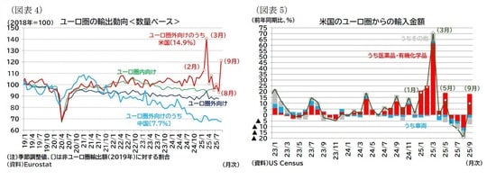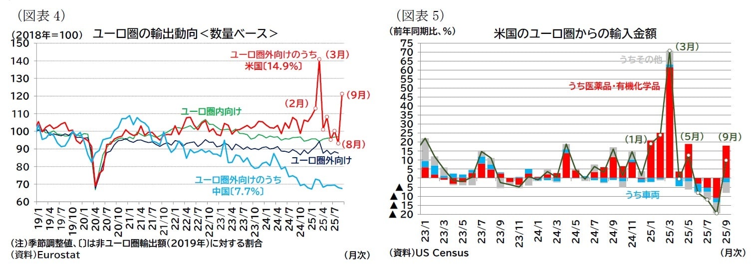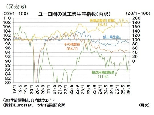 トランプ関税の影響を受けて、ユーロ圏の対米貿易は振れの大きい展開が続いている。2月から3月にかけて医薬品関税が引き上げられるとの懸念から対米輸出が急増、その後の対米輸出は前年比マイナスの状況となっていたが、9月には再び対米輸出が急増している[図表4・5]。ただし、生産指数に関しては2・3月にやや水準を切り上げた後は、ピークより低めの水準での一進一退の動きとなっており、輸出で見られるほどの盛り上がりは観測されない[図表6]。