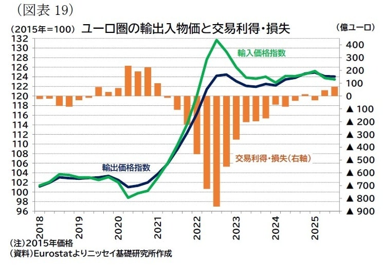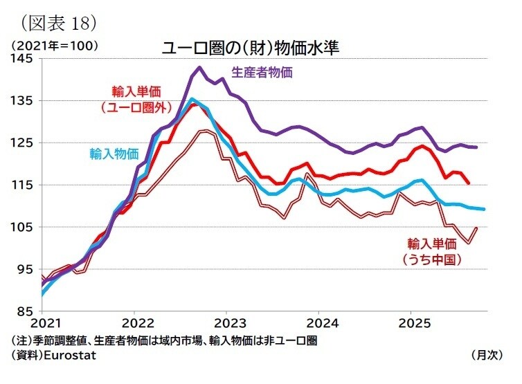 なお、トランプ関税を受けて、貿易網の混乱による貿易コストの上昇リスクが懸念される一方、中国による安価な財のユーロ圏への流入加速やユーロ高を受けた輸入物価の下押しリスクといった上下双方のリスクが指摘されている。足もと、中国からの輸入品の単価の低下も確認される[図表16]。ただし、輸入物価全体でみると輸入物価の低下幅は限定的であり、消費者物価の下押し圧力も限定的と言える[図表18・19]。