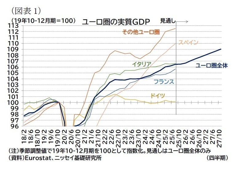 ユーロ圏1経済はコロナ禍とエネルギー危機といったショックに見舞われた後、緩やかな回復が続いている。2025年に入り、米トランプ大統領の各種政策、特に関税政策(トランプ関税)に翻弄されてはいるが、経済への悪影響は足もとまでのところ限定的にとどまっている。