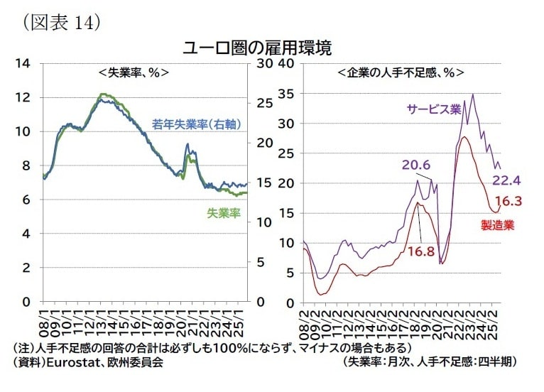 労働市場は良好な状況と言える。失業率は6%台半ばで低位安定している。人手不足感(欧州委員会調査)は、歴史的には高水準であるが、製造業・サービス業ともに緩和傾向をたどっている。ただし、足もとで特に製造業の人手不足感の緩和ペースが鈍化している[図表14]。