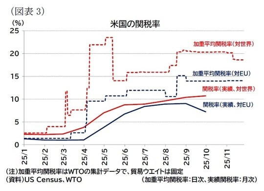 現時点における米国のEUへの関税措置は、他の主要地域対比で見れば負担感が軽く、年初と比較すれば大幅に悪化しているものの、他地域と比べて相対的に劣後している状況にはない[図表3]。