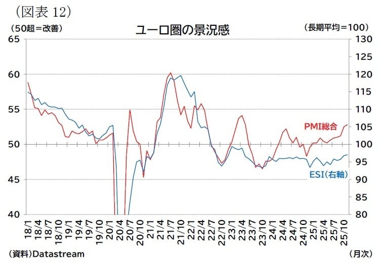 公共投資拡大を推進するドイツは5月に発足したメルツ首相率いる新内閣のもと、9月に25年予算が成立、11月には連邦議会で26年予算案が可決した(12月中に成立見込み)。予算案では5000億ユーロ規模のインフラ基金(債務ブレーキ対象外)などを活用し、25年以降に年1200億ユーロ前後(対ドイツ名目GDP比2.8%、対ユーロ圏名目GDP比0.8%)の公共投資を予定する10。時間的な制約から25年の支出は限定的となると思われるが、26年以降は公共投資の拡大が成長率を押し上げることが期待される11。