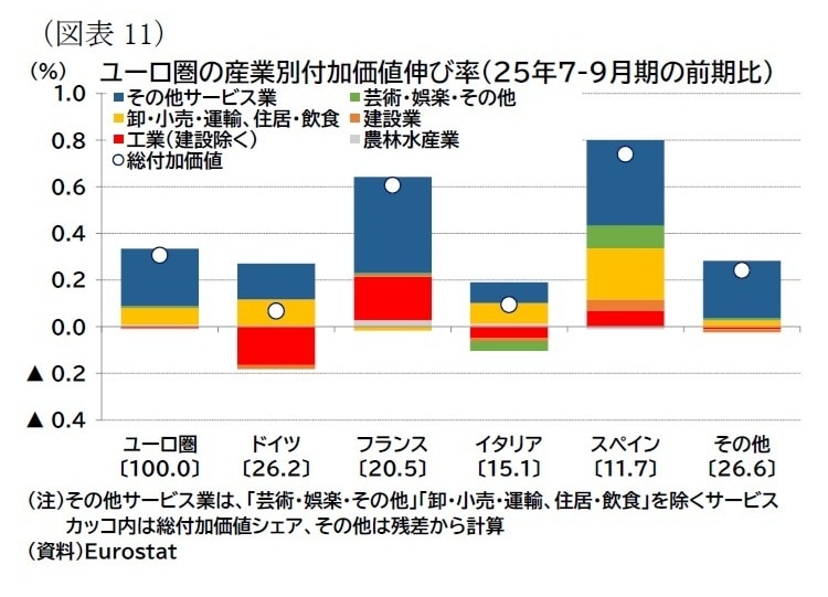 国別の成長率を需要項目別に見ると[図表10]、ドイツでは個人消費がマイナス成長であり、個人消費中心に高成長を維持しているスペインとは対照的な状況となっている。なお、フランスでは7-9月期に航空関連輸出が急増したことが成長率の押し上げ要因として目立つが、一時的な要因が大きく、また在庫の減少で相殺された部分も大きいと見られる3。産業別に見ると、ドイツやイタリアの工業の付加価値の伸びにマイナスが目立っている([図表11]赤棒)。