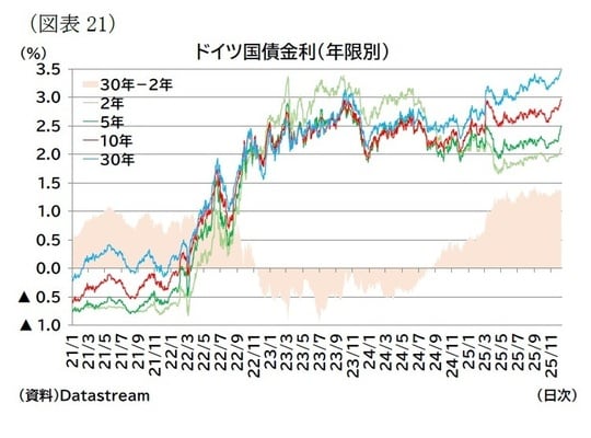 ユーロ圏の長期金利は、金融政策やインフレ関連データ、財政スタンス、米金利の動向に左右される展開が続いている。ドイツ10年債金利は、足もとで上昇圧力が強くなっている。ドイツの拡張的な財政見込みでタームプレミアム・リスクプレミアムが拡大するなか、ECBの追加利下げ観測の大幅な後退、一部で今後の利上げ観測も織り込まれはじめたこと受けて10年債金利は2%台後半まで上昇している[図表21]。また、ドイツ以外の加盟国において対独スプレッドの大幅拡大(いわゆる「分断化」)は見られていないが、フランスでは議会選挙以降の政局不安を受け長期金利の対独スプレッドが高めの状況が続いている[前掲図表20]。