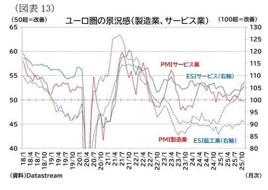 より足もとの状況をサーベイデータで確認すると、S&PグローバルのPMIは総合指数が50を上回る水準で改善傾向、欧州委員会調査のESIは低水準ながら、ここのところ緩やかに改善していることが分かる4[図表12・13]。前月からの変化に注目するPMIでは、製造業PMIが50前後で横ばい推移するなかでサービス業の景況感が大幅に改善した。景気の基調に注目したESIでは、小幅ながら足もとの景況感に改善の兆しがある。