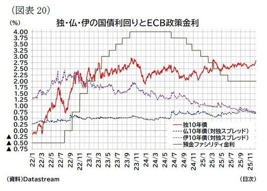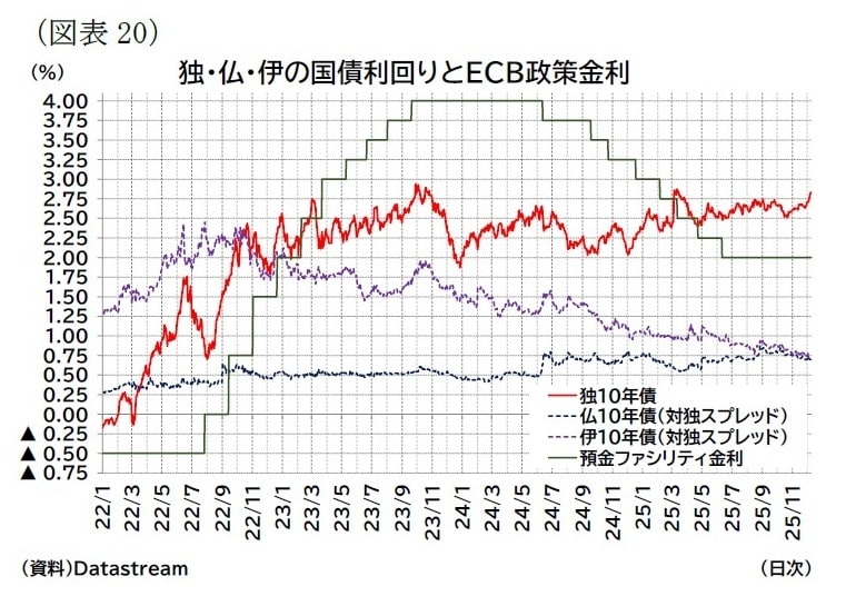 ECBは24年央から制限的な金融政策からの緩和を開始、今年6月にかけて政策金利(預金ファシリティ金利)を4.0%から中立金利推計(1.75-2.25%)の中央値である2.0%まで引き下げた後、7月以降は政策金利を据え置いている[図表20]。ラガルド総裁は現在の金利水準を「様子見する良い位置」と評しており、政策理事会メンバー内にはハト派(インフレ下振れリスク懸念派)、タカ派(インフレ再燃懸念派)の双方の意見があるものの、「不確実性が大きい状況下では様子見の価値が高い」とする見解は概ね一致しており、据え置きはこれまで全会一致で決まっている。