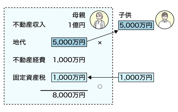 賃貸マンションから生じる収入金額は1億円であり、母親は土地の使用対価として子供に5,000万円の地代を支払っています。また、賃貸マンションに係る減価償却費や支払利息等の経費は1,000万円で、土地については子供が固定資産税1,000万円を負担しています。