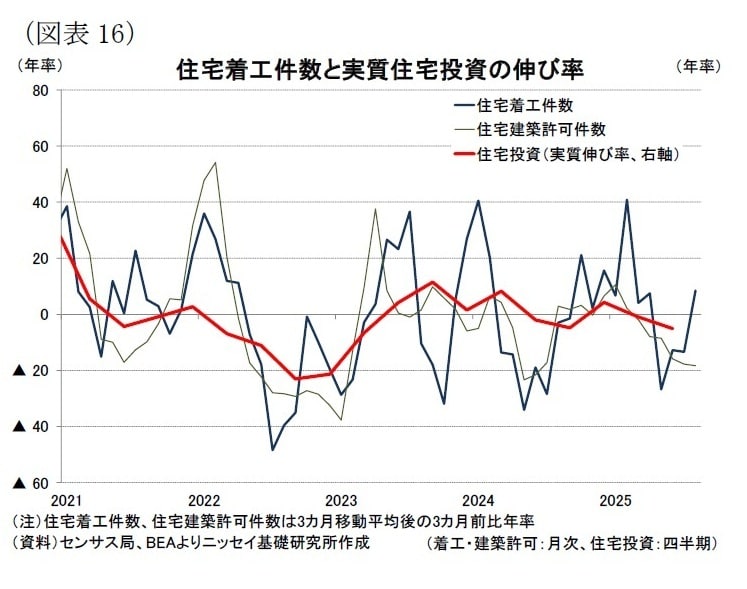 住宅着工件数は政府閉鎖の影響で9月以降の公表が遅れている。最新の25年8月の着工件数(3か月移動平均、3か月前比年率)は+8.5%(前月:▲13.4%)と、4か月ぶりにプラスへ転じた[図表16]。しかし、先行指標である住宅着工許可件数(同)は▲18.3%(前月:▲17.8%)と25年3月以降マイナスが続いており、6月以降は2桁の減少が継続している。このため、実質GDPにおける住宅投資は7ー9月期も3期連続でマイナス成長となる可能性が高い。