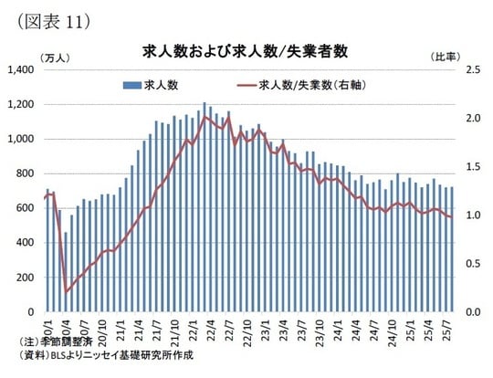 前述のとおり、雇用の鈍化がみられる中、労働需要の弱さも顕在化している。求人数は25年8月に723万人となり、24年11月の803万人から低下基調が続いている[図表11]。失業者1人当たりの求人件数も0.98件と21年3月以来となる1件割れとなり、労働需要の減退を示している。