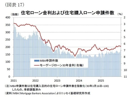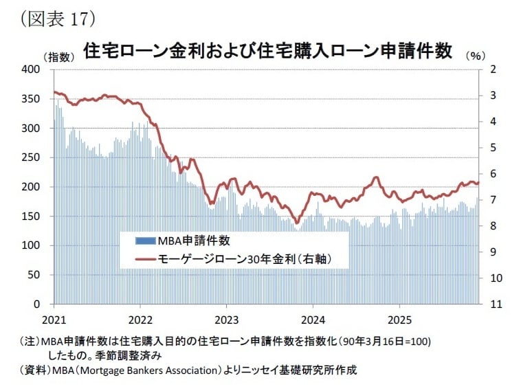 一方、住宅ローン金利は低下しつつある。11月28日の終了週には6.3%と23年4月以来の水準まで低下した[図表17]。また、米抵当銀行協会(MBA)が公表する住宅購入目的の住宅ローン申請件数(90年3月=100)は、金利低下を受けて11月21日の終了週に181.6と上昇し、23年2月以来の高水準となった。これらは足元の住宅需要が改善しつつある兆しを示している。