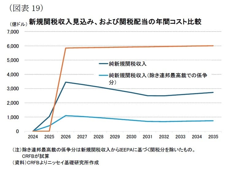 一方、トランプ大統領は新たな関税収入を財源として、国民1人当たり2,000ドル以上の配当を支払う構想を示している。しかし、米シンクタンクCRFBは、この関税配当には年間6,000億ドルの財源が必要と試算している[図表19]。これは新規関税収入の見込み額3,000億ドルを大きく上回り、さらにIEEPA関税が違憲となり代替措置がとられない場合の見込み額(1,000億ドル)からも大幅に乖離している。このため、関税配当の実現は極めて困難だろう。