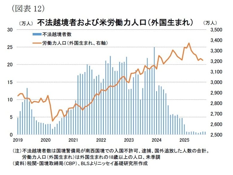 一方、労働供給面でも移民労働力の減少が続いている。トランプ政権の厳格な移民政策により、南部国境での不法越境者数は23年12月の25万人から急減し、25年1月以降は1万人を下回る水準で推移している[図表12]。その結果、外国生まれの労働力人口は25年3月の3,372万人をピークに、25年9月には3,207万人へと▲165万人減少した。