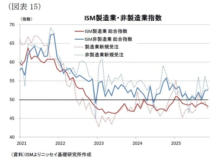 企業景況感をみると、製造業と非製造業で明暗が分かれている。非製造業では25年11月の景況感指数が52.6(前月:52.4)となり、2か月連続で好不況の境目である50を上回った[図表15]。ただし、新規受注は52.6(前月:56.2)と大幅に低下しており、先行き需要に対する慎重な姿勢がみられる。業種別では、情報関連が関税の影響で低調と指摘される一方、小売業は堅調とされ、関税の影響が残る中でも一部の業種では事業環境が改善している可能性が示されている。