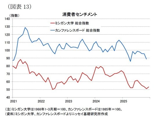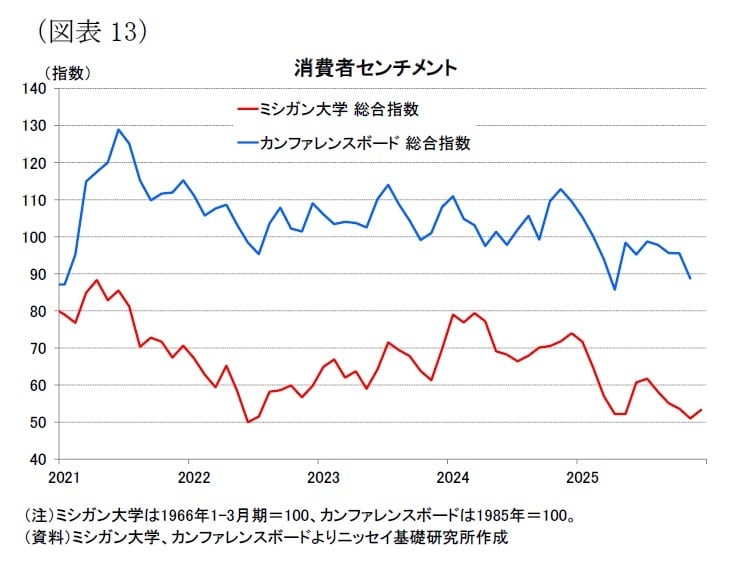 年末商戦は堅調とみられるものの、消費者センチメントは低迷している。25年11月のカンファレンスボード調査は25年4月以来の低水準となり[図表13]、インフレや雇用不安に加え、政府閉鎖がセンチメントを押し下げた可能性が指摘されている。実際に、同社チーフエコノミストのピーターソン氏は「経済に影響を与える要因に関して、物価・インフレ、関税・貿易、政治への言及が引き続き上位を占め、連邦政府の閉鎖に関する言及が増加した」としており、政府閉鎖がセンチメントのさらなる悪化に繋がった可能性を示唆した。また、ミシガン大学調査では、25年12月にインフレ期待の改善を受けて指数が小幅に持ち直したものの、依然として低迷圏にある。
