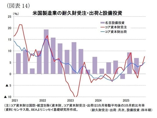 設備投資の先行指標であるコア資本財受注(3か月移動平均、3か月前比年率)は、25年9月に+7.6%(前月:+3.8%)となり、10ー12月期もプラス成長を示唆している[図表14]。