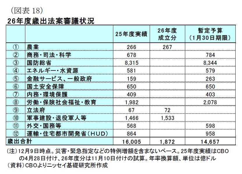 26会計年度(25年10月~26年9月)の開始時点で歳出法案が1本も成立しなかったため、10月1日から連邦政府機関が閉鎖された。その後、11月12日に26年度歳出法案12本のうち「農業」「立法府」「軍事建設・退役軍人等」の3本が成立した[図表18]。残りの9本についても、25年度の歳出実績をベースとした暫定予算が26年1月30日までの期限で成立し、史上最長となった政府閉鎖は43日間で終了した。
