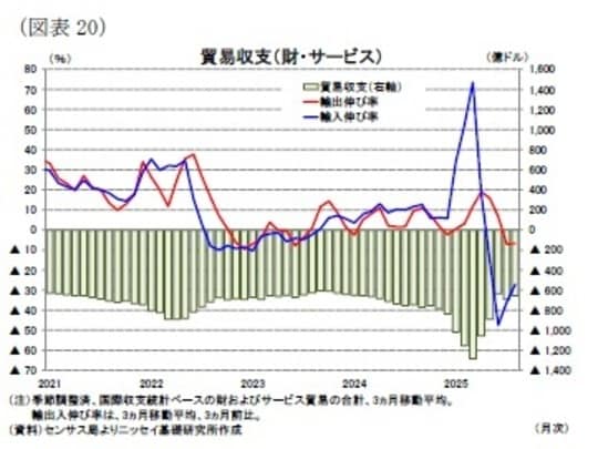 貿易収支統計は政府閉鎖の影響により遅延しており、25年8月分は11月19日に公表されたものの、9月以降の公表時期は未定である。8月の貿易収支(3か月移動平均)は季節調整済みで▲656億ドル(前月:▲695億ドル)となり、赤字幅は▲39億ドル縮小した[図表20]。輸出が+2億ドル増加し、輸入が▲37億ドル減少したことが背景である。このため、足元の統計では貿易赤字が縮小傾向にあり、外需の成長率寄与度は7ー9月期も前期の+4.8%ポイントに続いてプラスを維持した可能性が高い。