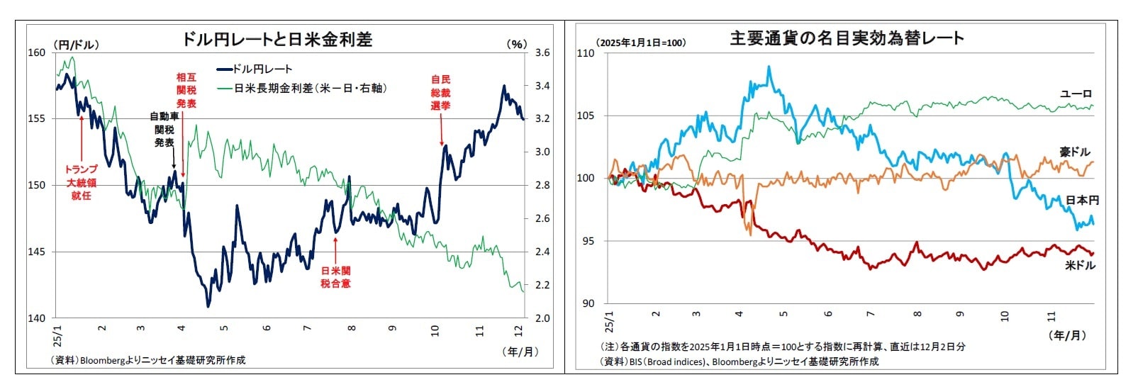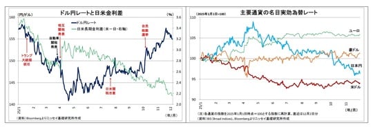 その後、初夏にかけてはドル、円ともに実効レートが下落し、ドル円レートは方向感を欠く展開となったが、7月以降は年末にかけて円安ドル高基調となった。各国との合意を受けたトランプ関税の引き下げなどを受けて米景気減速懸念が後退し、ドル実効レートは底堅い動きが続いた。