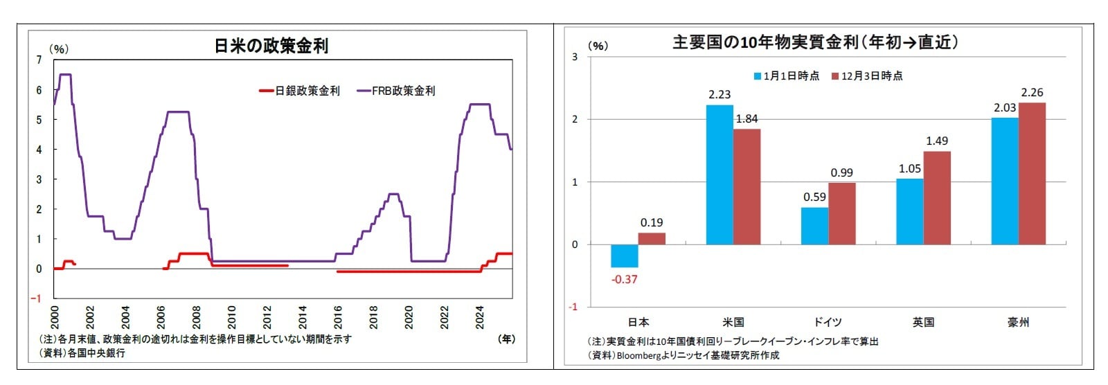 一年を通じて見ると、FRBが利下げ基調の一方で日銀が利上げ基調を維持し、日米の長期金利差は1.3%程度縮小している。それにもかかわらず結果として円高が殆ど進まなかった背景としては、(1)日本の期待インフレ率上昇によって実質金利(名目金利-予想物価上昇率)の上昇が抑制されたうえ、(2)日本の実質金利が「主要国で突出して低い水準」のままであった影響が大きいとみられる。また、従来同様、日本の企業や家計が積極的な対外投資を続けたことも円高の抑制要因になったと考えられる。