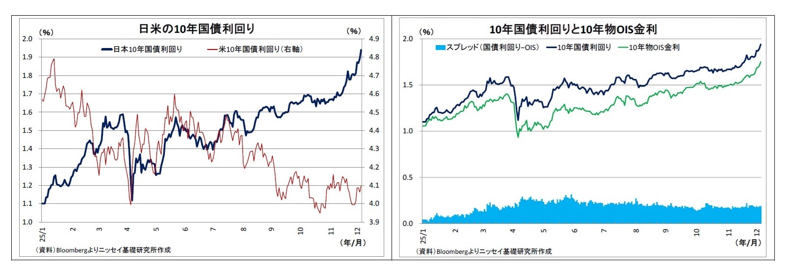 秋以降は、高市政権の発足に伴って財政拡張観測が高まった。供給制約が強い中での財政拡張によってインフレが加速するとの懸念が高まり(市場参加者の予想物価上昇率であるブレークイーブン・インフレ率は上昇)、日銀がビハインド・ザ・カーブに陥る懸念から中長期的な利上げ観測が高まった(10年物OIS金利が上昇)ことで金利上昇が促された。また、今後の国債増発への警戒が高まったことで、タームプレミアムも開いたままで推移した。