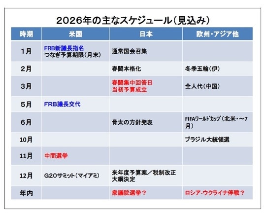 それでは、2026年の金利・為替市場にとってどのような展開になるのだろうか?スケジュールを踏まえつつ、内外の主な注目材料を点検してみる。