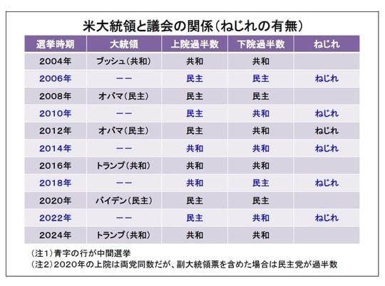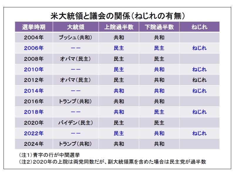 従来、中間選挙は大統領(が属する党)への批判票が集まりやすいとされ、上院か下院で、大統領と異なる政党が過半数を占める「ねじれ」が多く発生してきた。近年でも中間選挙で毎回ねじれが発生しており、この点から言うと、2026年の中間選挙では共和党が不利ということになる。