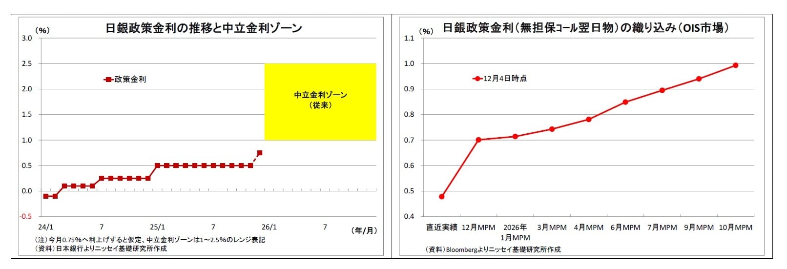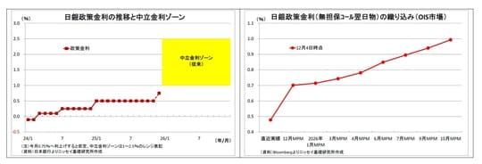 18-19日に行われた12月MPM(金融政策決定会合)での0.75%への利上げが決定した。2026年に次回の利上げする際にはこれまで日銀が分析例として示してきた中立金利(景気・物価に対して中立的な金利水準)のレンジ「1~2.5%くらい」の下限に達することになる。