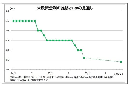 FRBは雇用の下振れリスク上昇を受けて、2025年9月と10月に利下げを実施。9月FOMC時点のドットチャート(FOMCメンバーの政策金利見通し)では、2026年も追加で利下げを実施する見通しが示されていたが、どのようなペースでどこまで利下げするかがポイントになる。