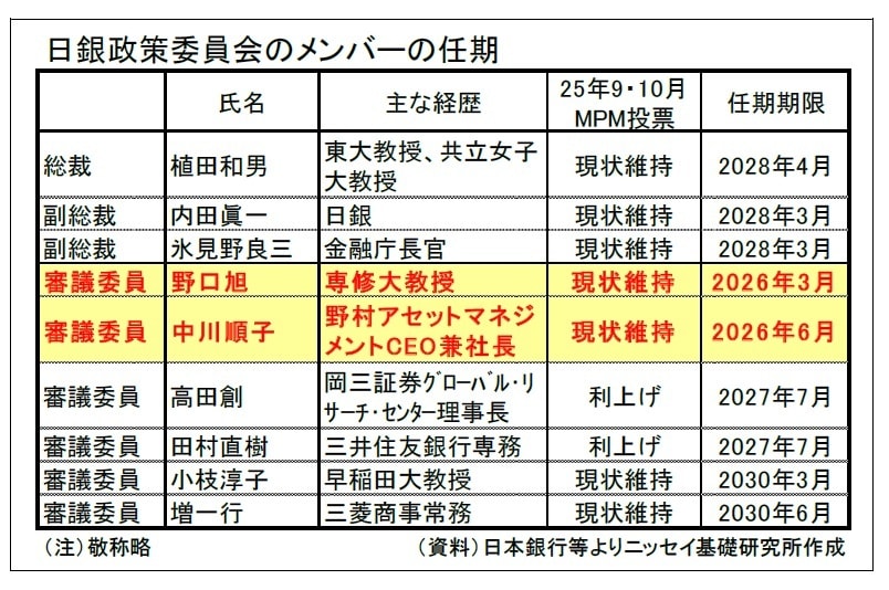 これに関連して、日銀人事も注目される。2026年3月と6月に審議委員2名の任期が期限を迎えるためだ。経済財政諮問会議や日本成長戦略会議に多くのリフレ派エコノミストを起用した高市政権が、審議委員の後任にリフレ色の強い人材を充てるかがポイントだ。