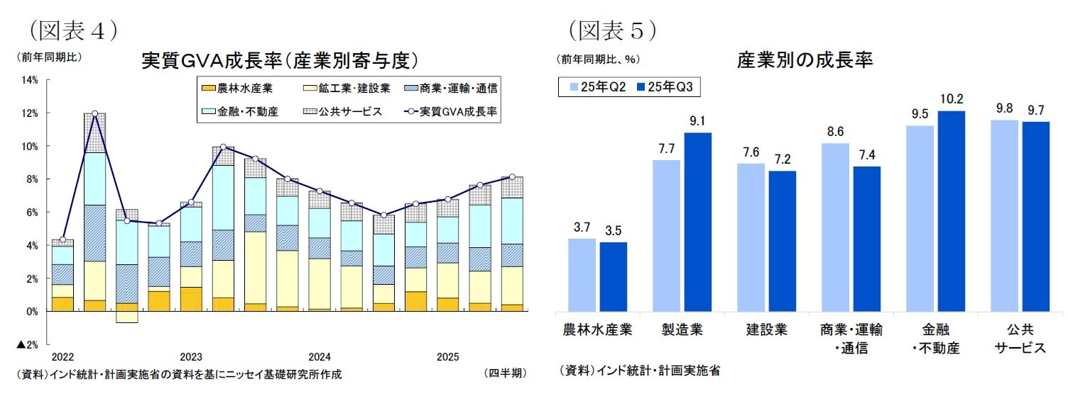産業別(GVA)では、実質GVA成長率は前年同期比8.1%(前期:7.6%)とやや上昇した。主要6部門のうち 製造業、金融・不動産、公共サービスが高い伸びを示し、経済全体をけん引した[図表4]。