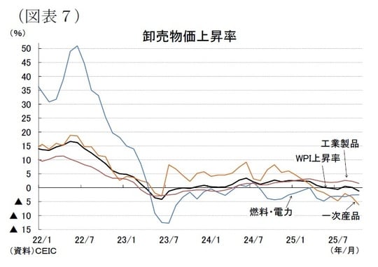 CPIの内訳をみると、食品・飲料と燃料・電力の弱さが物価の押し下げ要因となっている。食品・飲料は豊作・輸入増加・2024年の高騰に伴う反動などが押し下げ要因となり、6月以降マイナスの伸びが続いている。燃料・電力は国際原油価格の落ち着きや再生可能エネルギー比率の上昇に伴うコスト構造の安定化により、2024年にマイナスが定着し、足元でも2%台の低い伸びが続いている。