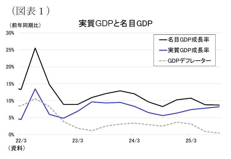 一方、名目GDP成長率は前年同期比8.7%と前期の8.8%から小幅に低下した。