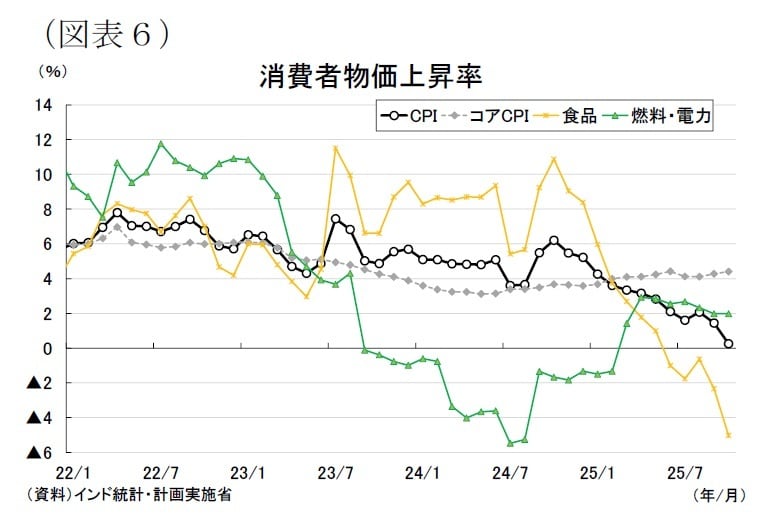企業物価(WPI)は総合で0%程度の低い伸びが続いており、供給面のコスト圧力は限定的である[図表7]。内訳では、一次産品と燃料・電力がいずれもマイナスの伸びとなっており、原材料価格やエネルギーコストの落ち着きが鮮明である。こうした動きは、足元の消費者物価の低下とも整合的であり、当面の物価上昇圧力は抑制されている。