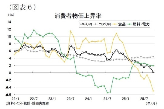 消費者物価はディスインフレが進み、総合CPIは2025年に入って急速に低下している。2022年には7%前後まで達したが、その後は鈍化が続き、2024年は4~5%台、2025年は1%台へと低下。7月以降は中銀の物価目標(2~6%)を下回る状態が続いている[図表6]。
