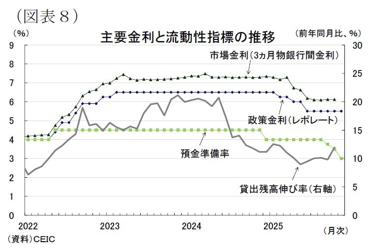 RBIは、2022年のインフレ急伸局面で政策金利(レポレート)を6.5%まで引き上げた後、2024年末以降は景気の減速感や外部環境の不透明さを背景に金融緩和に転じた[図表8]。2024年12月には、RBIが預金準備率(CRR)の0.5%ポイント引き下げを発表し、銀行部門の流動性を直接押し上げた。さらに、2025年6月にはCRRを年内に合計1%ポイント引き下げる方針が示され、9~11月にかけて実施された。流動性環境は一段と緩和方向に傾きつつある。