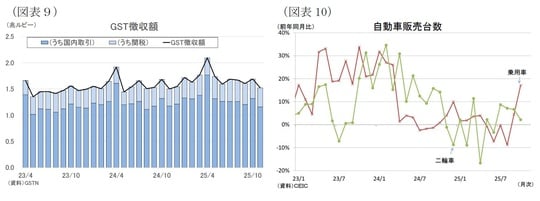 GST徴収額は、州際取引の精算や輸入動向の影響を大きく受けるため、GST2.0の施行直後に明確な上振れは確認されない[図表9]。一方で、国内取引ベースの収入は、10月に前月比で増加したが、これは例年の祭事商戦に伴う季節的な消費・流通増が主因である。