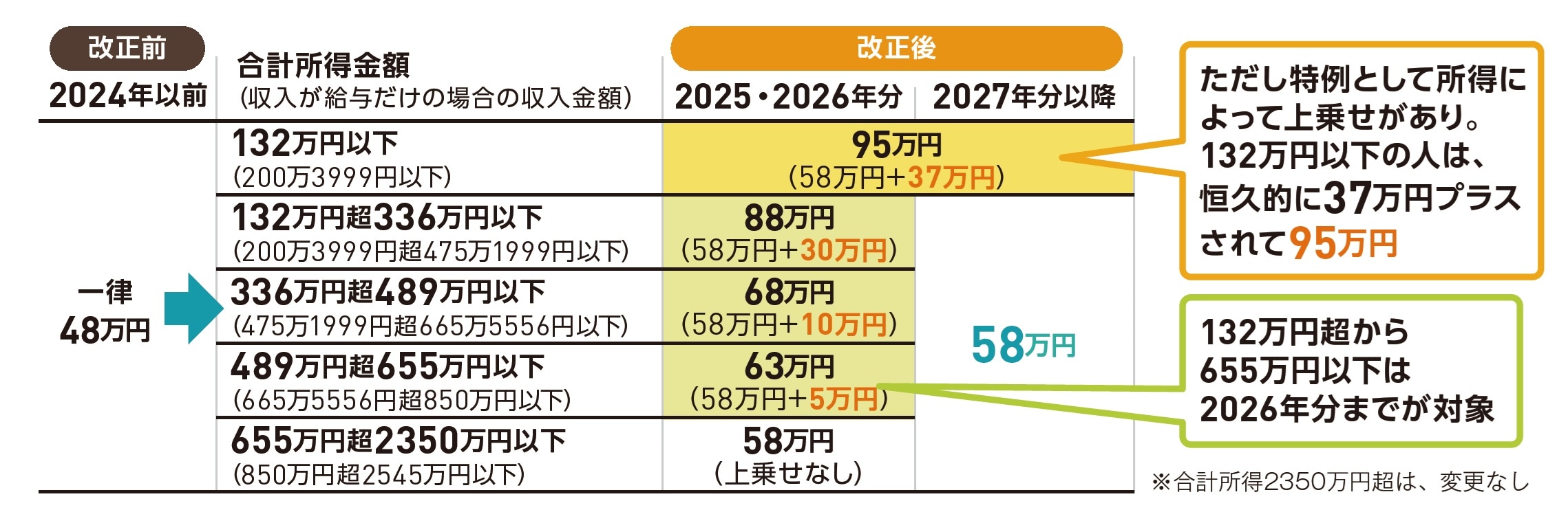 基礎控除額は、合計所得額2350万円(給与収入2545万円)以下の人を対象として、一律48万円から58万円へ10万円の引き上げ。さらに特例として合計所得に応じ、+37万円、+30万円、+10万円、+5万円と段階的な加算があります(図表3参照)。