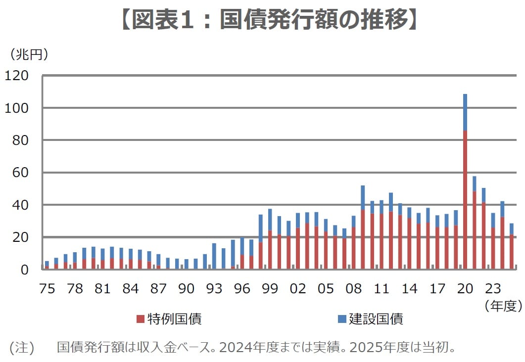 国債発行額について、1975年度以降の推移は図表1の通りです。1996年度以降、赤字国債と呼ばれる特例国債の発行が顕著に増え、全体の発行額を押し上げていることが分かります。2020年度は、新型コロナウイルスの感染拡大に対応した大規模な財政支出を行ったため、急増しましたが、その後、発行額は抑制されつつあります。なお、図表1において、2025年度は28.6兆円となっていますが、これは当初予算の数字です。