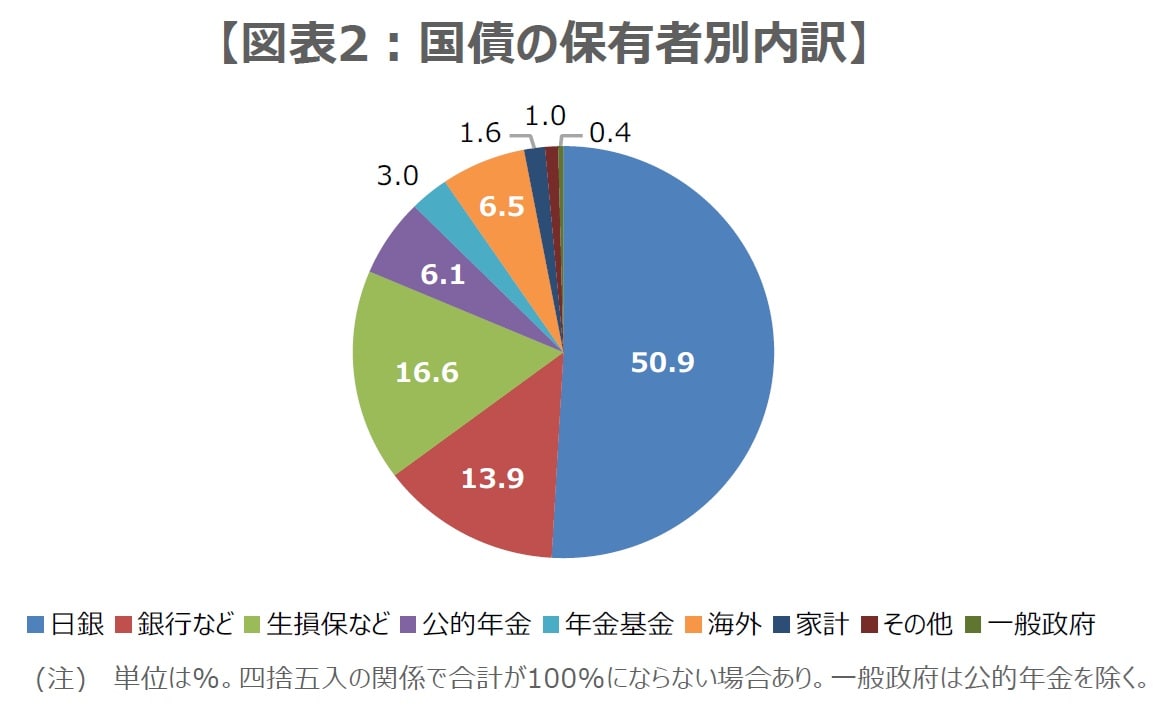 高市首相は、債務残高GDP比を引き下げることで財政の健全性に配慮し、市場からの信認を確保する考えも示していることから、2026年度の当初予算が極端に膨張する可能性は低く、国債発行についても短期・中期ゾーンの増額が想定されます。これに加え、国債は日銀を筆頭におおむね安定保有されていることから(図表2)、長期国債と超長期国債の利回りが急騰し、国内市場の波乱要因となるリスクは、今のところ限定的とみています。