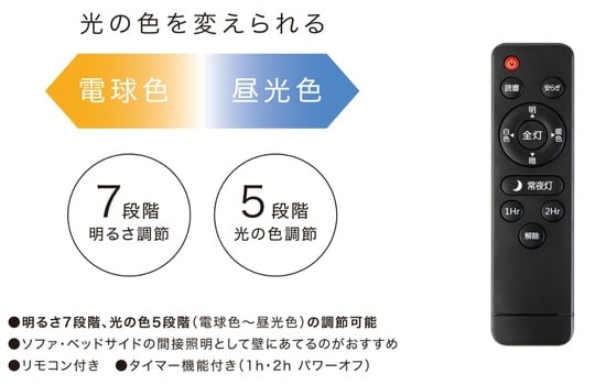 調光・調色機能付きで明るさ7段階、光の色5段階調整が可能